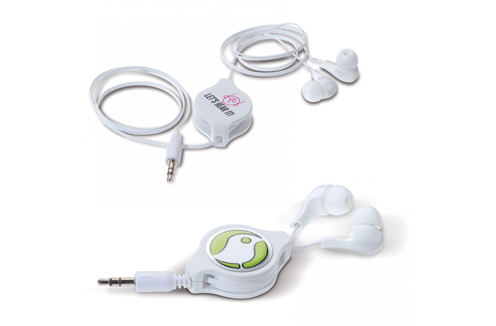 Sisäänkelautuvat nappikuulokkeet, 3.5 mm liitin. Sisäänkelautumismekanismin ansiosta johdot eivät mene solmuun. Linssitarra-merkkaus.
